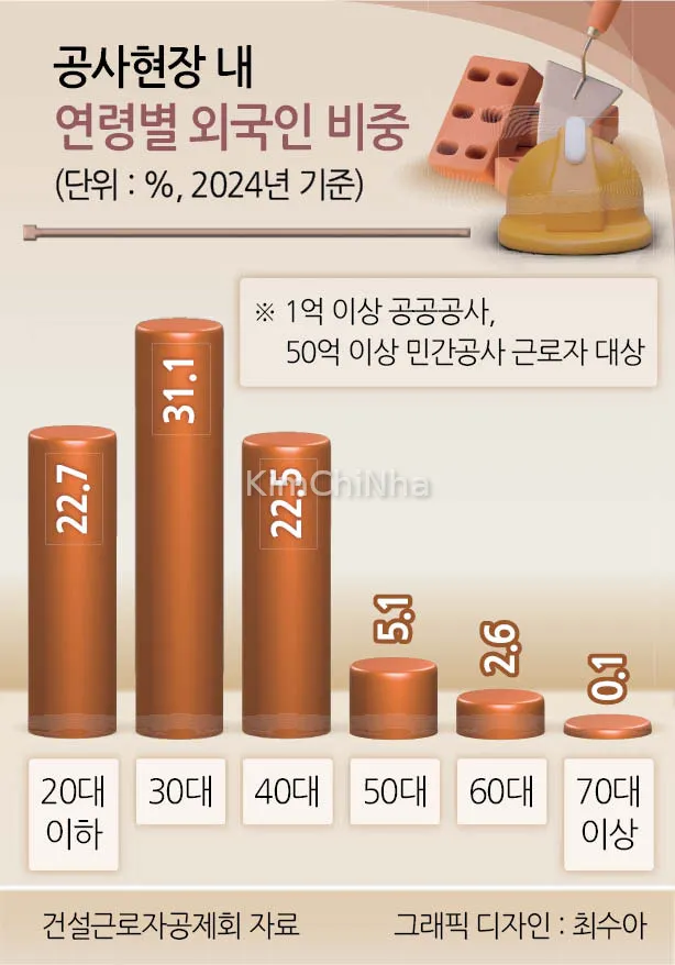Trong khi lao động Hàn Quốc trung bình 45,7 tuổi mới vào ngành xây dựng, thì lao động từ Campuchia (29,2 tuổi), Myanmar (30,7 tuổi), Thái Lan (30,9 tuổi) thường trẻ hơn nhiều, kinh nghiệm ít hơn.