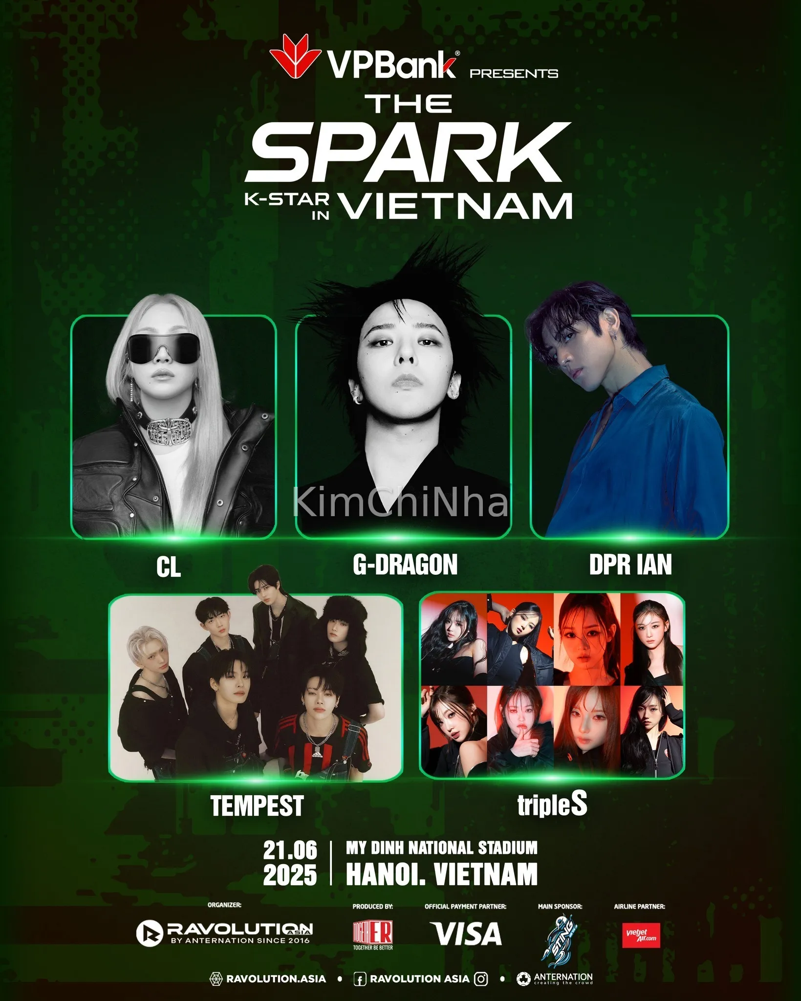 Sự kiện âm nhạc VPBank K-Star Spark in Vietnam Mega Concert 2025 sẽ chính thức diễn ra vào 21/6 tại sân vận động Mỹ Đình, với đội hình nghệ sĩ quốc tế cực khủng: G-Dragon, CL, DPR IAN, TEMPEST, tripleS, cùng một nghệ sĩ Việt Nam đặc biệt chưa công bố.