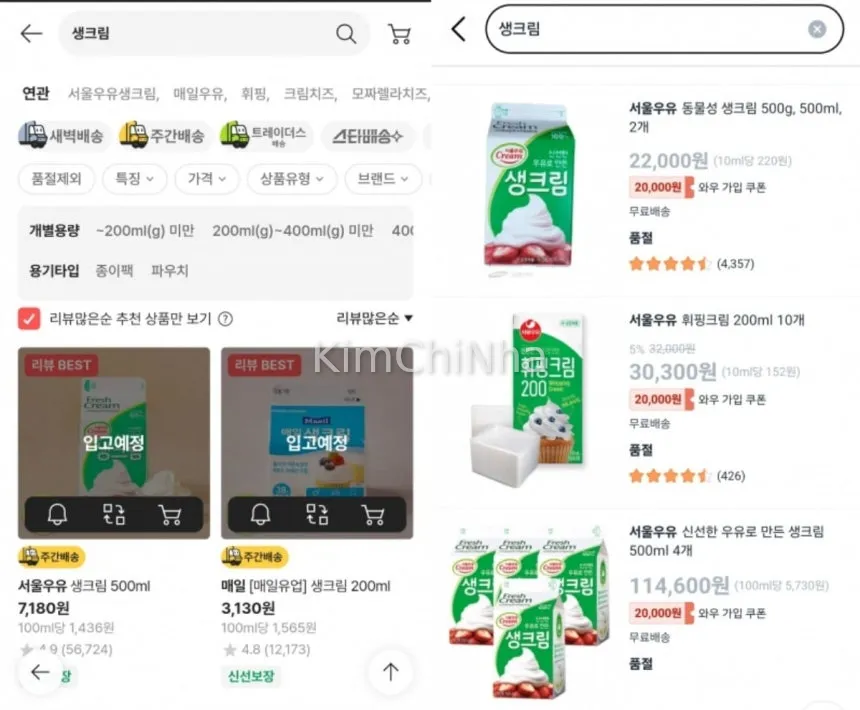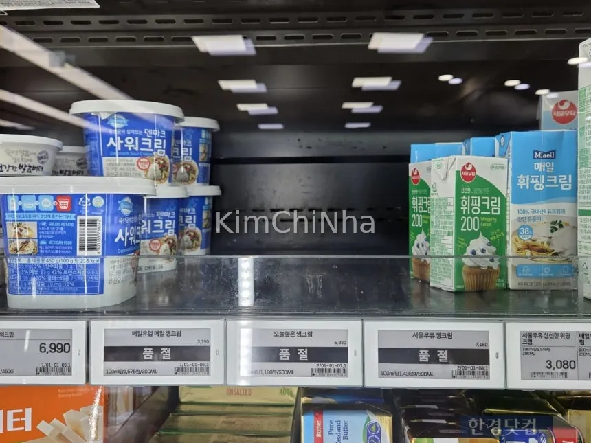 Theo thông tin từ ngành bán lẻ Hàn Quốc vào ngày 19/7, nhiều siêu thị lớn đã thông báo hết sạch hàng kem tươi. Tình trạng tương tự cũng diễn ra trên các nền tảng như Coupang, Market Kurly,... Dù một số chợ online vẫn còn hàng, nhưng giá đã tăng gấp đôi, từ mức bình thường khoảng 7.000 won (khoảng 130.000 VND) lên đến 17.000–18.000 won (khoảng 320.000–340.000 VND) cho mỗi chai 500ml.