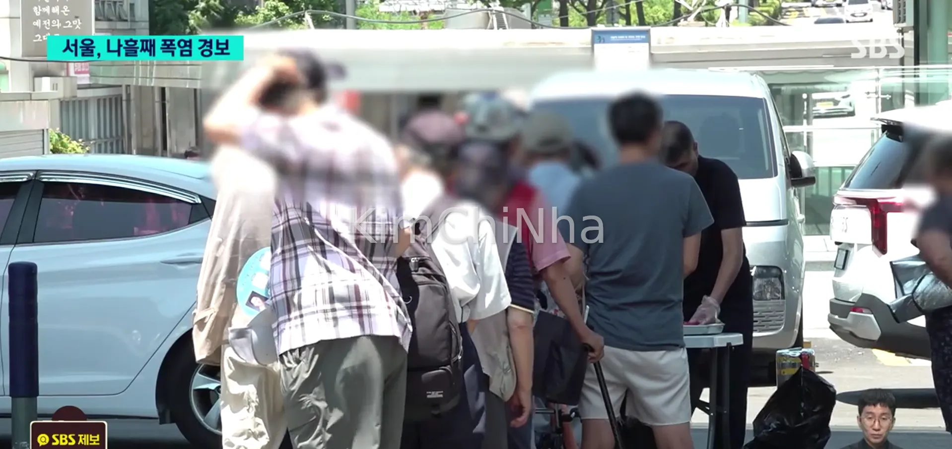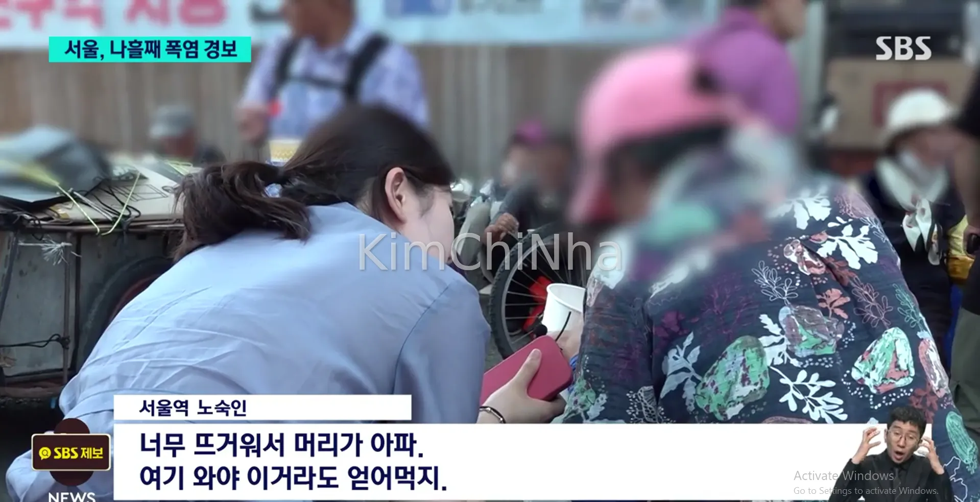 Phóng viên Dong Eun-young đã ghi nhận tại khu vực Ga Seoul vào buổi trưa hôm nay. Hàng dài người vô gia cư xếp hàng chờ nhận món canh dưa hấu mát lạnh. Dưới cái nắng như đổ lửa, không có lấy một bóng râm để tránh nóng, nền đất xung quanh ghi nhận nhiệt độ vượt quá 40 độ C.