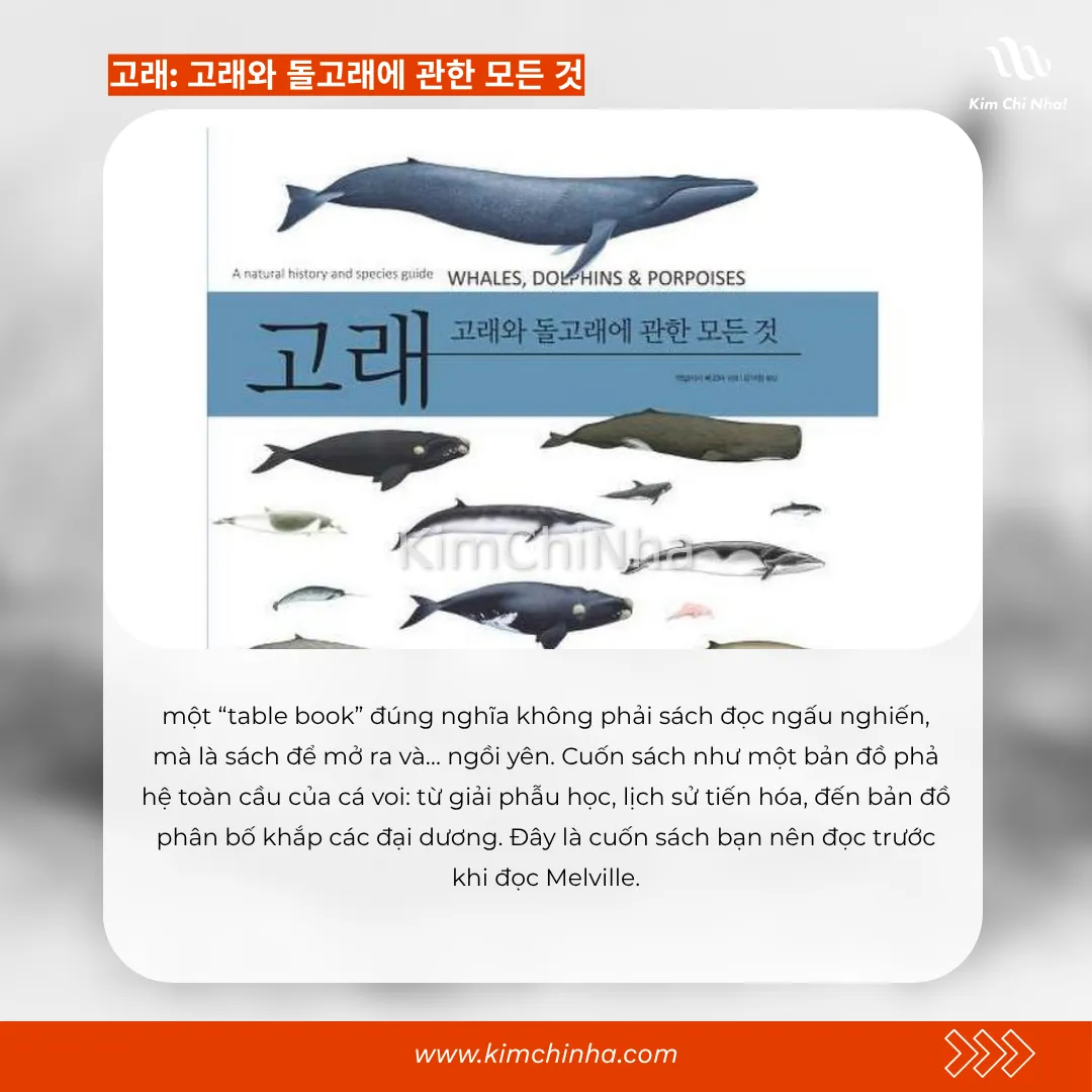 📘 고래: 고래와 돌고래에 관한 모든 것 là một “table book” đúng nghĩa không phải sách đọc ngấu nghiến, mà là sách để mở ra và… ngồi yên. Cuốn sách như một bản đồ phả hệ toàn cầu của cá voi: từ giải phẫu học, lịch sử tiến hóa, đến bản đồ phân bố khắp các đại dương. Đây là cuốn sách bạn nên đọc trước khi đọc Melville. Còn nếu bạn cần một người dẫn đường đặt câu hỏi trước khi đưa thông tin, thì 알쏭달쏭 고래 100문 100답 là thứ bạn cần.