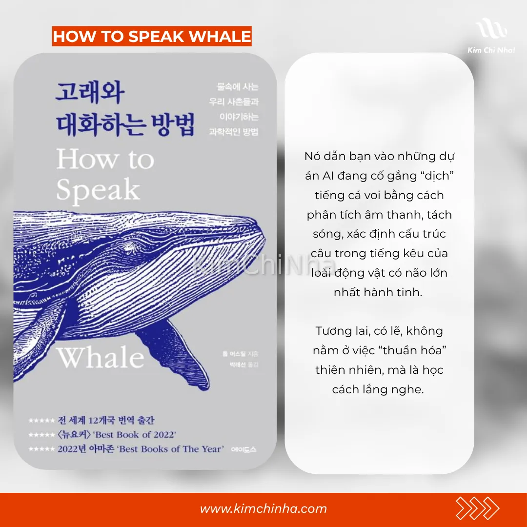 Cuốn 고래와 대화하는 방법 không nghĩ vậy. Nó dẫn bạn vào những dự án AI đang cố gắng “dịch” tiếng cá voi bằng cách phân tích âm thanh, tách sóng, xác định cấu trúc câu trong tiếng kêu của loài động vật có não lớn nhất hành tinh.