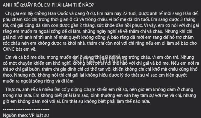 Sang nước ngoài giúp việc hay chăm sóc người thân vốn là một quyết định xuất phát từ tình cảm gia đình, nhưng thực tế lại tiềm ẩn nhiều rủi ro, đặc biệt nếu bạn còn trẻ và chưa quen với môi trường sống, luật pháp và văn hóa mới. Mới đây, trên một cộng đồng mạng Việt Nam, một câu chuyện đã gây xôn xao: một cô gái 22 tuổi sang Hàn Quốc phụ chăm chị gái mới sinh nhưng gặp tình huống vô cùng nhạy cảm với chồng chị - người nhiều lần có hành vi quấy rối.