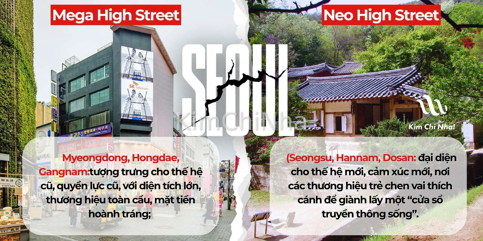 Neo High Street (Seongsu, Hannam, Dosan) đại diện cho thế hệ mới, cảm xúc mới, nơi các thương hiệu trẻ chen vai thích cánh để giành lấy một “cửa sổ truyền thông sống”.