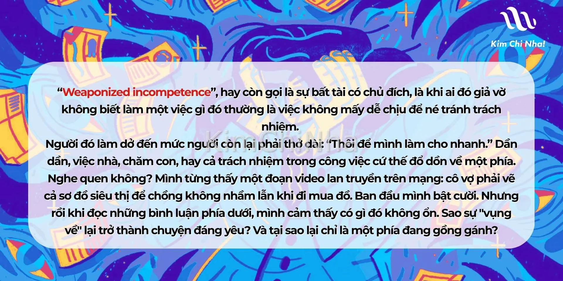 Mình đã từng đọc đâu đó câu nói: “Có những người làm sai không phải vì không biết, mà vì biết chắc rằng người khác sẽ sửa.” Và mình nghĩ, có lẽ không gì diễn tả đúng hơn cái gọi là “weaponized incompetence” một khái niệm tưởng xa lạ nhưng thật ra lại hiện diện quá rõ trong đời sống hằng ngày của rất nhiều người, đặc biệt là phụ nữ.