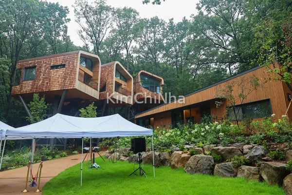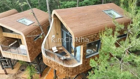 Trên diện tích gần 10.000㎡, khu nghỉ dưỡng sở hữu 18 căn nhà gỗ với 25 phòng nghỉ (cho 2 6 người), kèm theo quán cà phê giữa rừng, nhà hàng, vườn chủ đề và đường mòn dạo bộ. Đặc biệt, 3 căn treehouse cao tới 14m, được thiết kế với phần trần trong suốt ngay trên giường ngủ cho bạn trải nghiệm ngắm sao từ chính chăn ấm của mình.