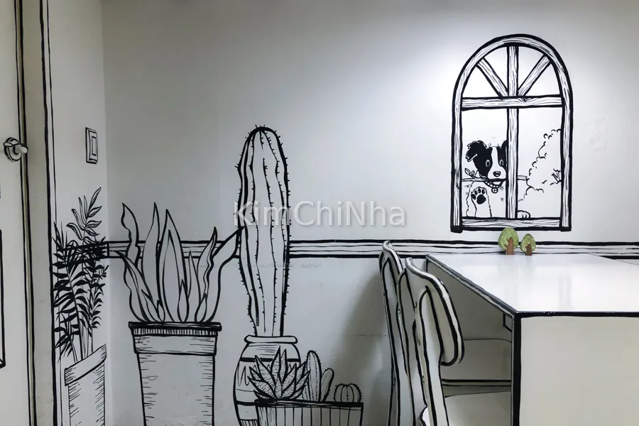 4. Không gian chụp hình: Greem Café còn chú trọng tạo các góc “sống ảo” độc đáo, từ cầu thang, sân thượng cho đến những khu vực nhỏ với ghế dài và cây cảnh vẽ 2D. Chỉ cần một bức hình, bạn sẽ có cảm giác như đang tham gia vào một bộ truyện tranh đen trắng sống động, mỗi góc quán đều là một cảnh quay hoàn hảo.
