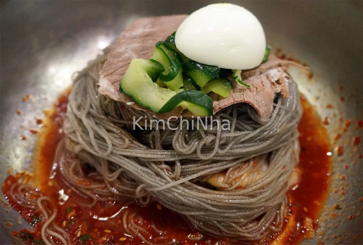 Yeolmu Naengmyeon: ăn kèm kimchi củ cải non, vị chua tươi mát, rất hợp ngày nắng.