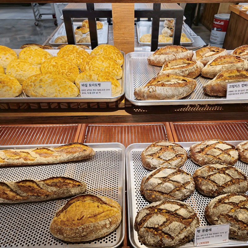 Món bestseller chính là baguette kem phô mai mâm xôi – ít ngọt, béo dịu và rất hợp với kết cấu giòn của vỏ bánh. Ngoài ra, các món như baguette trứng cá minh thái, bánh bí đỏ nếp, bánh basil-cà chua hay cream cheese – hạt hỗn hợp cũng cực kỳ hút khách. Dù tiệm đã mở rộng sang khu gần ga Seokchon, nhưng nếu đi trễ tầm chiều muộn, khả năng bạn chỉ ngắm kệ bánh trống trơn là rất cao.