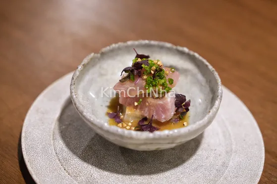 Đậu hũ kiều mạch: mềm mượt như nhím biển, ăn kèm sashimi, sốt vinaigrette dầu perilla – miso – giấm, rắc thêm kiều mạch rang giòn.