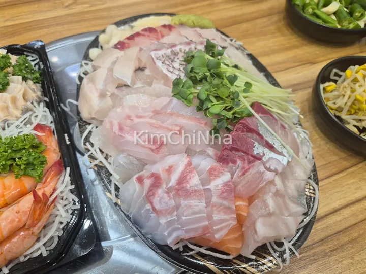 Sau khi chọn hải sản, bạn cầm túi sashimi vừa cắt xong lên tầng 2. Ở đó có nhiều nhà hàng nhỏ, nơi bạn có thể ngồi ăn sashimi với đủ loại nước chấm, rau cuốn, kimchi, tỏi, ớt, tất cả đều được chuẩn bị sẵn.