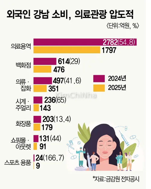 Chi tiêu bình quân theo dịch vụ cũng tăng. Đặc biệt, Sinsa-dong, Seocho-dong, Apgujeong và Cheongdam là những khu vực dẫn đầu trong tiêu dùng y tế và làm đẹp.