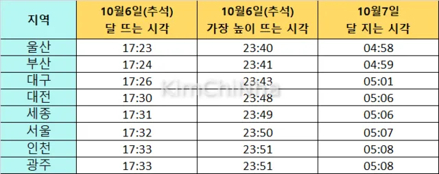 Theo Viện Nghiên cứu Thiên văn Hàn Quốc, thời gian trăng rằm mọc tại từng địa phương như sau: Ulsan 17 giờ 23 phút, Busan 17 giờ 24 phút, Daegu 17 giờ 26 phút, Daejeon 17 giờ 30 phút, Sejong 17 giờ 31 phút, Seoul 17 giờ 32 phút, Gwangju và Incheon 17 giờ 33 phút. Như vậy, những khu vực phía đông bán đảo Hàn Quốc sẽ nhìn thấy trăng sớm hơn một chút.