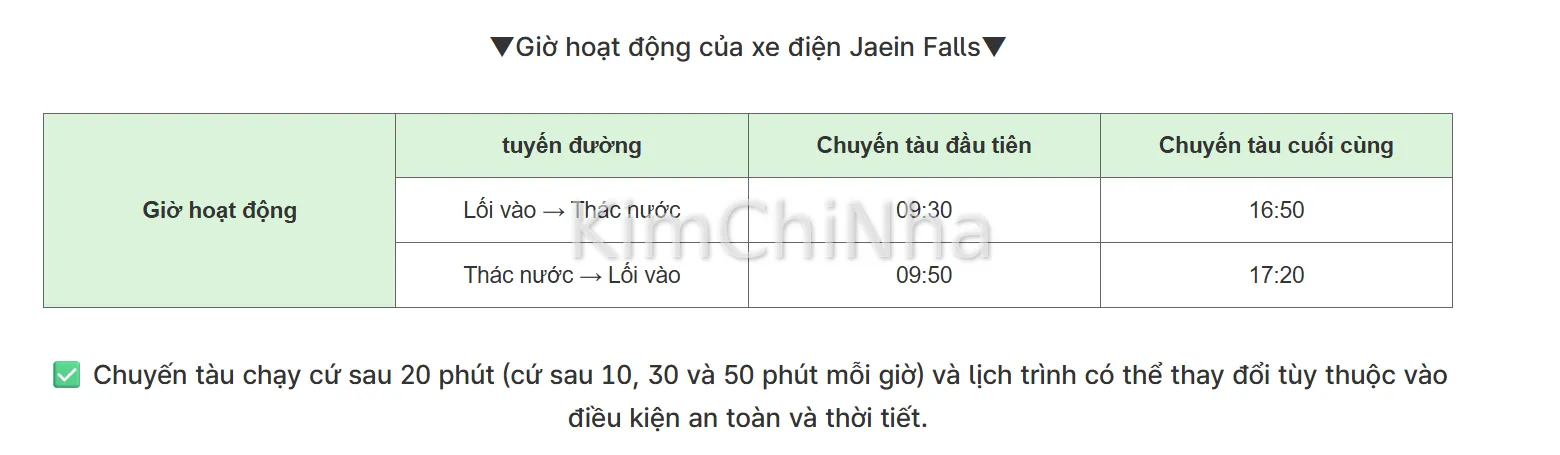 Di chuyển: Thác Jain nằm ở Yeoncheon, Gyeonggi-do. Từ cổng vào đến thác khoảng 20 phút đi bộ. Nếu không muốn đi bộ, bạn có thể sử dụng xe điện đưa đón với giá rất hợp lý: 1,000 KRW/người/lượt. Địa điểm này phù hợp hơn cho những ai đi bằng ô tô cá nhân.