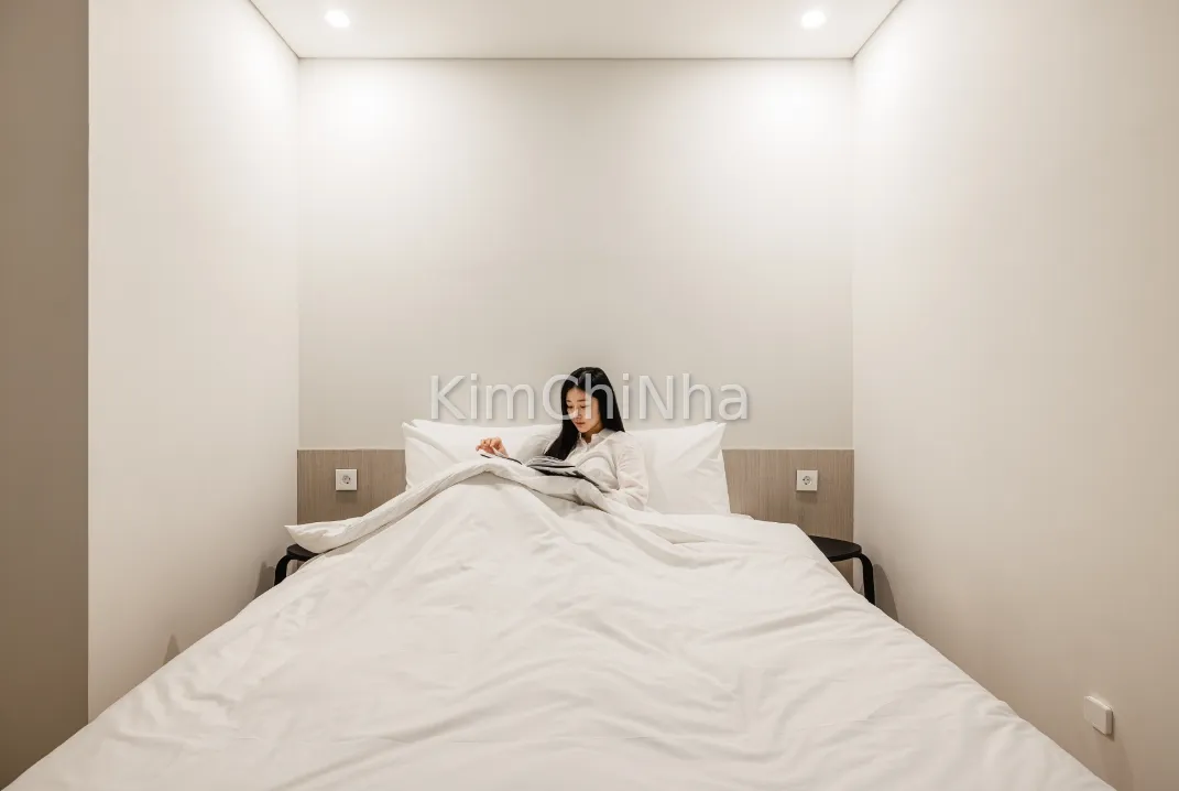 Giường ngủ đơn sắc, đèn đọc sách treo trần, máy chơi nhạc nhỏ, thảm ngồi và sổ tay ghi chú…  tất cả khiến căn phòng giống một thiền viện đương đại hơn là khách sạn.