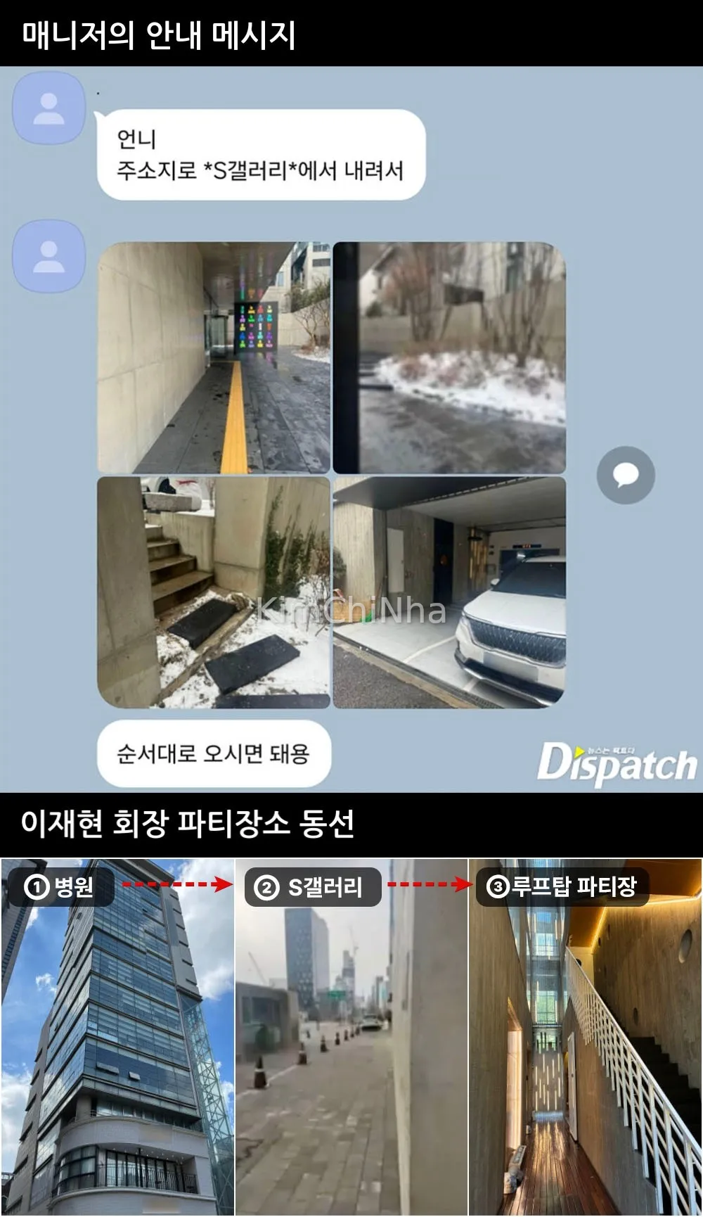 Dispatch còn thu thập được tin nhắn từ quản lý, là người đóng vai trò tuyển chọn và sắp xếp khách mời. Nội dung tin nhắn chỉ rõ địa điểm gặp mặt tại Cheongdam-dong cùng lời dặn dò kín đáo.