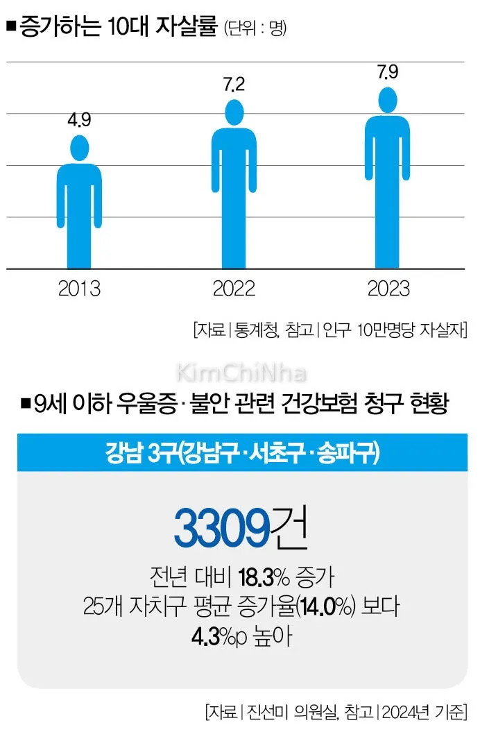 Số liệu cũng phản ánh mối lo ngại này. Năm 2023, tỷ lệ tự tử ở nhóm tuổi 10–19 là 7,9 trên 100.000 người, tăng 9,7% so với năm 2022. Riêng tại khu “tam giác vàng” Gangnam (bao gồm Gangnam, Seocho, Songpa), số trẻ dưới 9 tuổi khám bệnh vì trầm cảm và lo âu đã tăng 18,3%, từ 2.797 ca (2022) lên 3.309 ca (2023), vượt xa mức trung bình của Seoul (14%).
