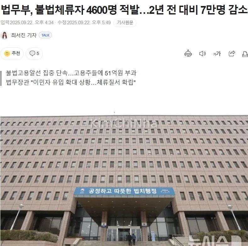 Từ năm 2023, chính phủ Hàn Quốc triển khai “Kế hoạch 5 năm giảm số lượng cư trú bất hợp pháp” với hệ thống giám sát thường xuyên và đa dạng hóa hình thức kiểm soát. Nhờ vậy, số lượng người cư trú bất hợp pháp đã giảm từ 430.000 người vào tháng 10/2023 xuống còn 360.000 người vào tháng 9/2025, tức là giảm hơn 70.000 người chỉ sau gần hai năm.