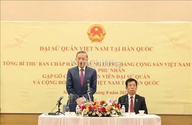 (Tổng Bí thư Tô Lâm gặp gỡ cán bộ Đại sứ quán và cộng đồng người Việt Nam tại Hàn Quốc.)