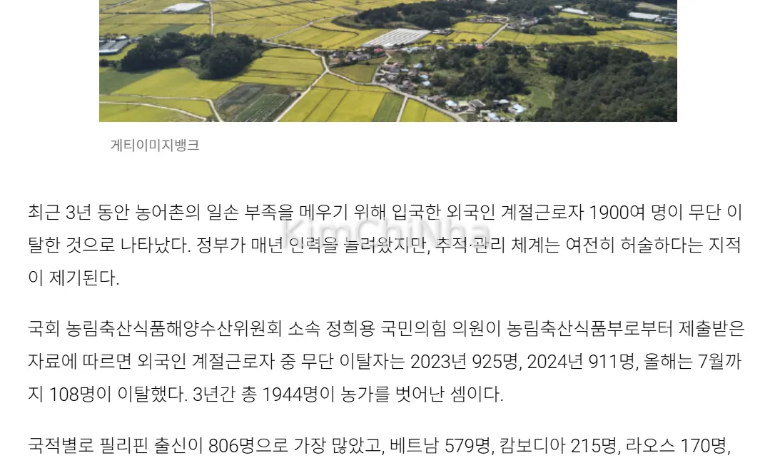 Trong ba năm gần đây (2023–2025), gần 1.944 lao động nước ngoài làm việc theo diện lao động thời vụ (visa E-8) đã bỏ trốn khỏi nơi làm việc ở Hàn Quốc. Con số này được công bố bởi nghị sĩ Jeong Hee-yong thuộc đảng Quyền lực Quốc dân sau khi Bộ Nông nghiệp, Lâm nghiệp và Thực phẩm Hàn Quốc cung cấp báo cáo chính thức.
