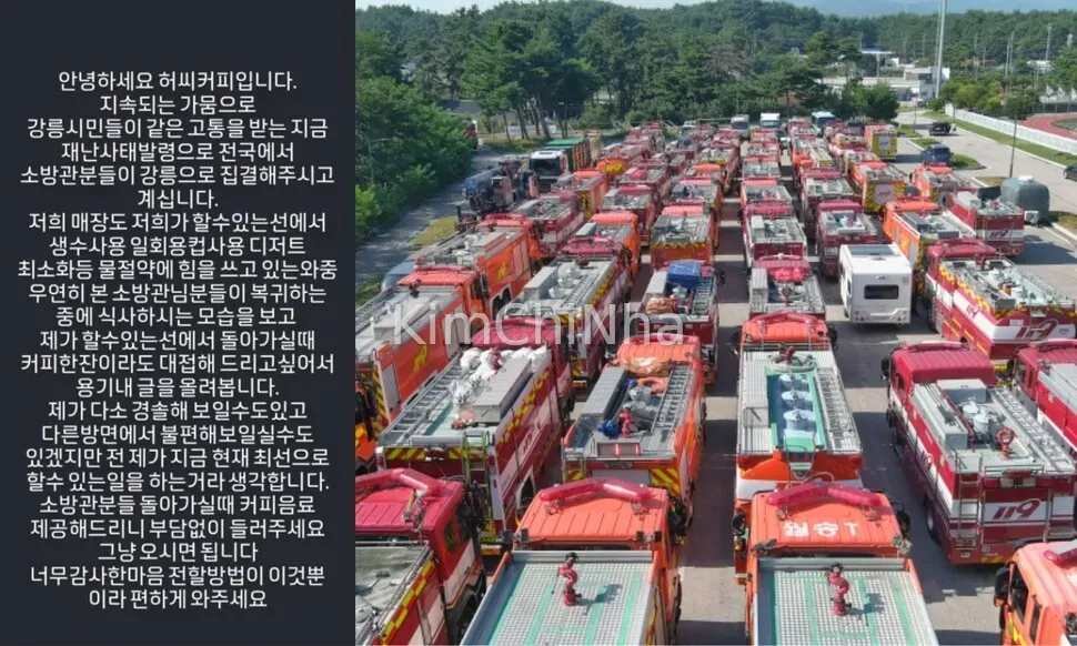 Tạm dịch bài viết trên Instagram của quán: Xin chào, chúng tôi là Huhui Coffee. Như các bạn đã biết, thành phố Gangneung đang phải trải qua hạn hán nghiêm trọng. Do tình hình khẩn cấp, các đội cứu hỏa từ khắp cả nước đang tập trung về đây. Quán chúng tôi cũng đang cố gắng tiết kiệm từng giọt nước và sử dụng chất tẩy rửa tối thiểu để rửa các vật dụng ăn uống dùng một lần. Trong lúc đó, tình cờ nhìn thấy cảnh các nhân viên cứu hỏa chuẩn bị bữa ăn, tôi muốn mời họ một ly cà phê như một cách để bày tỏ lòng biết ơn. Chúng tôi hiểu rằng có thể sẽ có chút bất tiện cho những người lính cứu hỏa khi đến đây, nhưng chúng tôi vẫn sẽ cố gắng làm những gì tốt nhất có thể. Chúng tôi sẽ phục vụ cà phê và đồ uống miễn phí cho các anh khi các anh trở về. Xin đừng ngại ngần, cứ đến thôi. Đây là cách duy nhất chúng tôi có thể bày tỏ lòng biết ơn sâu sắc. Xin hãy đến một cách thoải mái nhé.