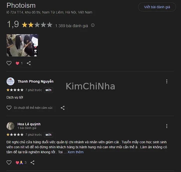Tính đến sáng ngày 14/07, Google Maps của cửa hàng Photoism tại Mỹ Đình đã bắt đầu xuất hiện những đánh giá 1 sao từ cộng đồng. Người dùng bày tỏ sự thất vọng với cách làm việc của nhân viên cửa hàng, cho rằng "không đủ trách nhiệm trong bảo vệ khách hàng".