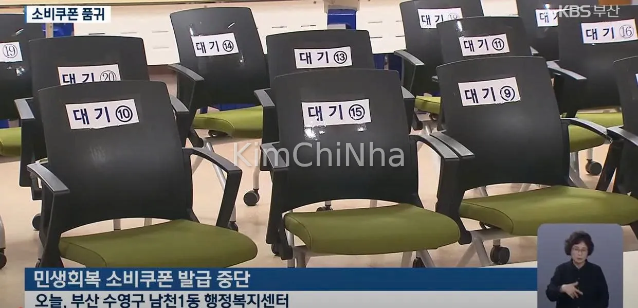 Tại một trung tâm hành chính ở quận Suyeong, thành phố Busan, khu vực chờ nhận phiếu tiêu dùng hoàn toàn trống rỗng. Trên bảng thông báo, dòng chữ "tạm dừng phát hành thẻ trả trước" được dán lên rõ ràng. Những thẻ có giá trị 180.000 won (khoảng hơn 3 triệu đồng) dành cho công dân không thuộc diện hộ nghèo hiện đã hết sạch hoàn toàn.