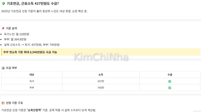 Năm nay, một người cao tuổi sống một mình có thu nhập hàng tháng 2,28 triệu won (hoặc cặp vợ chồng có thu nhập 3,648 triệu won) vẫn có thể nhận lương hưu cơ bản. Đặc biệt, vì mức “thu nhập công nhận” được tính sau khi trừ nhiều khoản miễn giảm, một người độc thân có thu nhập thực tế đến 4,37 triệu won/tháng, hoặc một cặp vợ chồng có thu nhập 7,45 triệu won/tháng (tương đương 89,4 triệu won/năm) cũng có thể thuộc diện nhận trợ cấp.