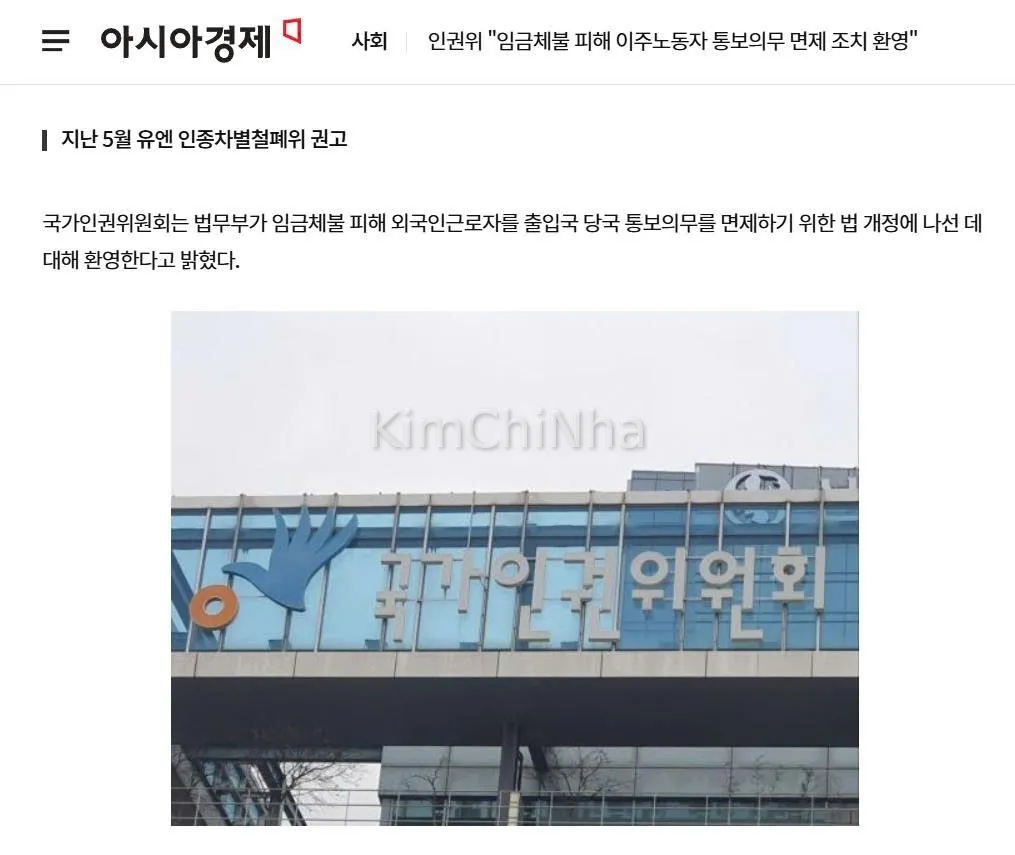 Tháng 5/2024, Ủy ban Xóa bỏ Phân biệt Chủng tộc Liên Hợp Quốc (CERD) đã bày tỏ lo ngại trước tình trạng trên, đồng thời khuyến nghị Hàn Quốc cần mở rộng phạm vi miễn trừ nghĩa vụ thông báo, để lao động nhập cư – đặc biệt là người cư trú bất hợp pháp – có thể yên tâm tố cáo các vi phạm về quyền lao động.