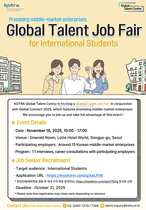 KOTRA Global Talent Center sẽ tổ chức Global Talent Job Fair vào ngày 18/11/2025, tại khách sạn Lotte World (Seoul). Đây là sự kiện nằm trong khuôn khổ Global Connect 2025, kết nối du học sinh quốc tế và nhân tài toàn cầu với các doanh nghiệp Hàn Quốc đang cần tuyển dụng.