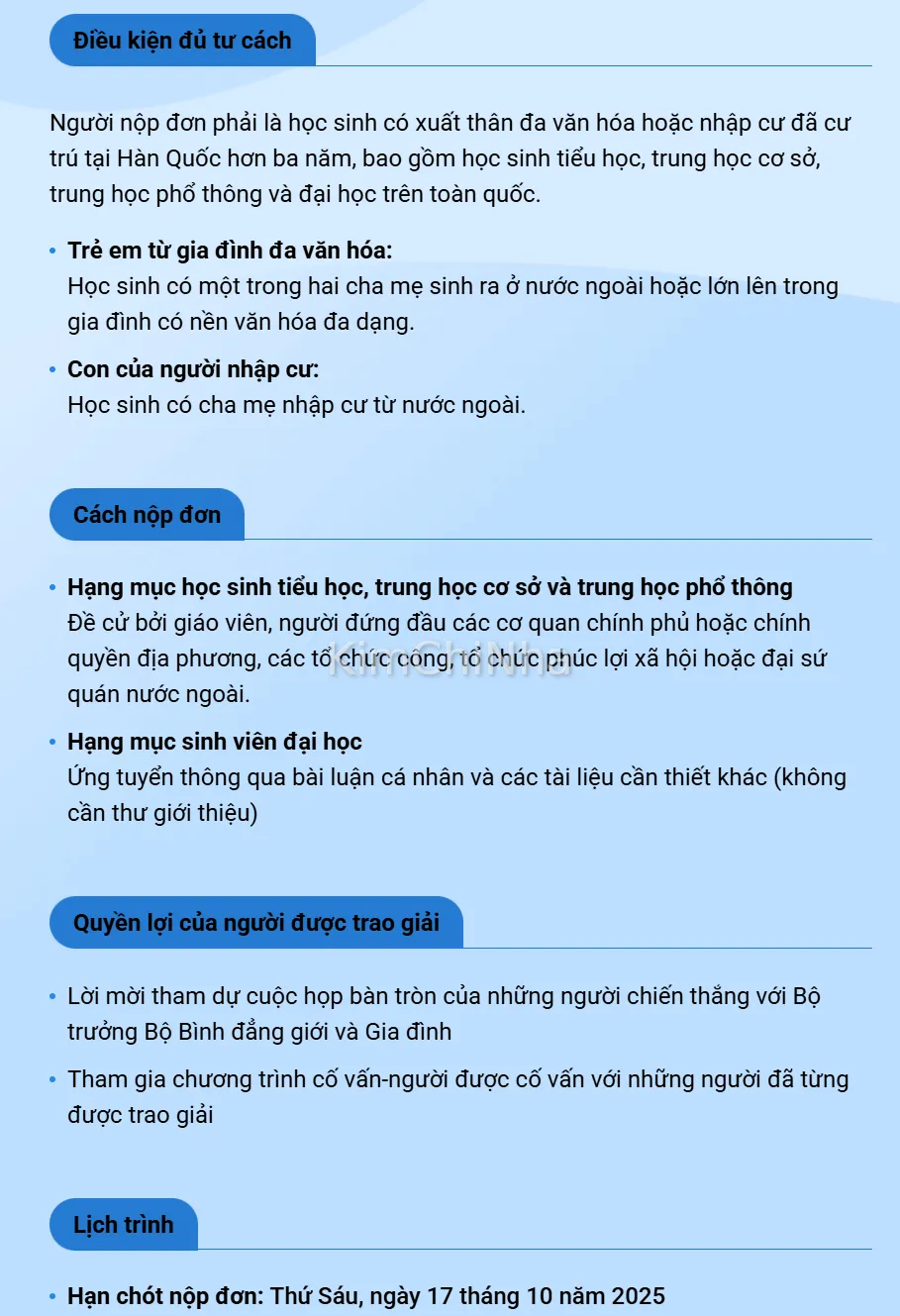 Đây là một giải thưởng đặc biệt dành cho các bạn học sinh, sinh viên có nền tảng đa văn hóa (Multicultural) và quốc tế (Global) đang sinh sống tại Hàn Quốc.
