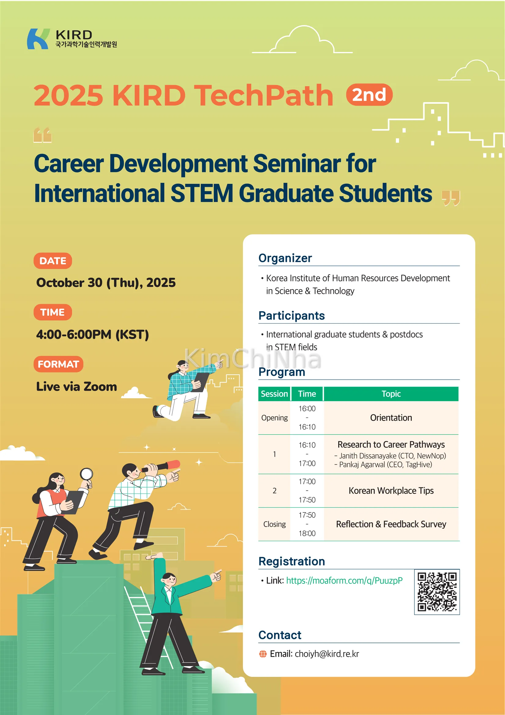 Viện Phát triển Nhân lực Khoa học và Công nghệ Hàn Quốc (KIRD – Korea Institute of Human Resources Development in Science & Technology) sẽ tổ chức hội thảo nghề nghiệp “2025 KIRD TechPath 2nd: Career Development Seminar for International STEM Graduate Students” vào ngày 30 tháng 10 năm 2025, từ 16:00 đến 18:00 (giờ Hàn Quốc), trực tuyến qua Zoom.