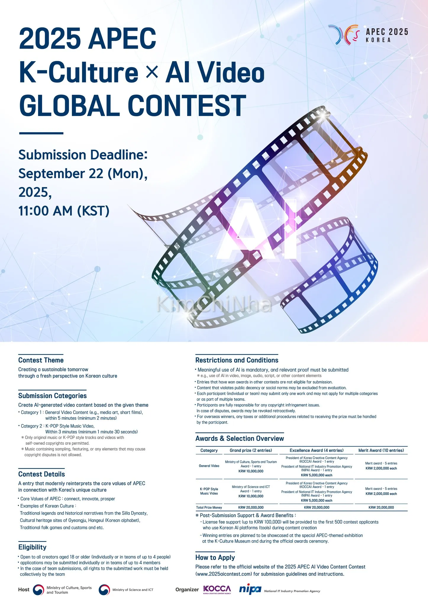 Cuộc thi Video AI APEC 2025 là sân chơi dành cho những nhà sáng tạo muốn khám phá sự giao thoa giữa văn hóa truyền thống Hàn Quốc và công nghệ AI hiện đại. Cuộc thi sẽ là cơ hội để bạn thể hiện tài năng và sự sáng tạo, đồng thời đóng góp vào việc định hình một tương lai bền vững.