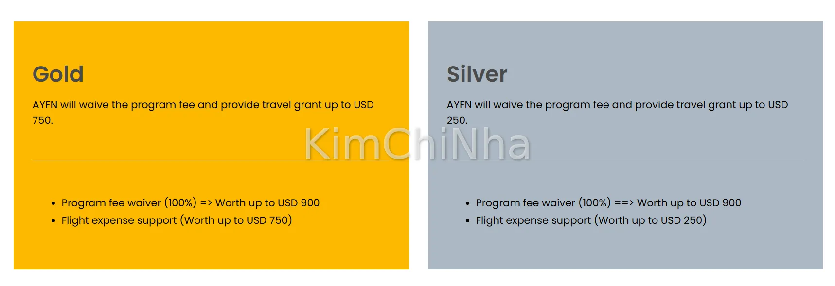 AYFN cung cấp hai cấp độ học bổng (Gold và Silver), đều hỗ trợ đáng kể chi phí chương trình và di chuyển.