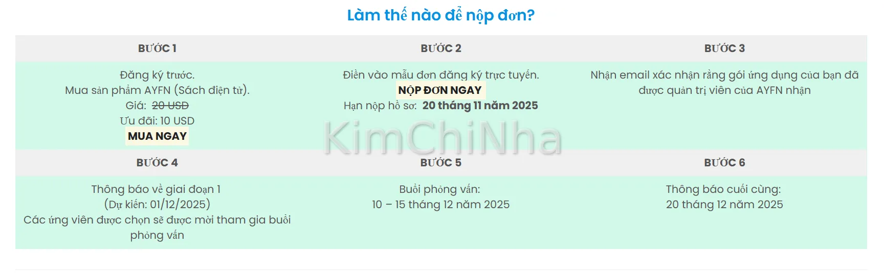 BẮT BUỘC: Tất cả ứng viên phải mua một E-book độc quyền có tiêu đề "Beyond Borders: Embracing the Global Network" (Giá trị thực: 20 USD, Ưu đãi: 10 USD) như một phần của quy trình nộp hồ sơ. AYFN hợp tác với tác giả/nhà xuất bản để tài trợ cho chương trình học bổng.