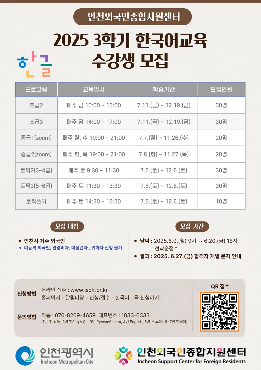 Trung tâm Hỗ trợ Người nước ngoài Incheon (ISCFR) chính thức mở đơn đăng ký cho chương trình học tiếng Hàn kỳ 3 – năm 2025, với nhiều lớp từ sơ cấp đến luyện thi TOPIK, hoàn toàn miễn phí dành cho người nước ngoài đang cư trú hợp pháp tại Incheon!