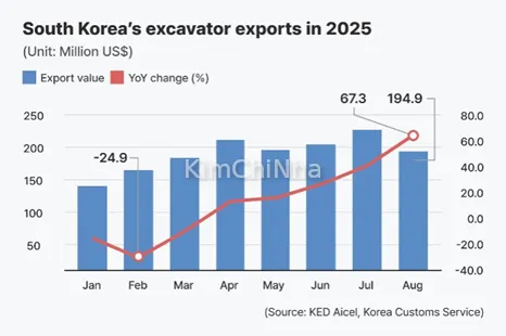 Các nền kinh tế mới nổi đang phát triển mỏ mới, tạo sóng đơn hàng quốc tế cho máy xúc, máy xúc lật, thiết bị khoan của Hàn Quốc. Theo KED Aicel, xuất khẩu máy xúc Hàn Quốc tháng 8 đạt 194,9 triệu USD, tăng 67,3 phần trăm so với cùng kỳ, tương đương khoảng 5,26 nghìn tỉ VND, đồng thời nối dài chuỗi tăng bốn tháng liên tiếp.