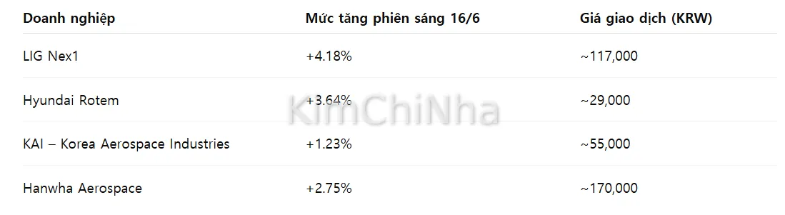 Cổ phiếu quốc phòng và hàng không – vũ trụ Hàn Quốc đồng loạt tăng mạnh trong phiên giao dịch sáng thứ Hai (ngày 16/6), khi giới đầu tư chuyển hướng sang các mã phòng thủ mang tính an toàn hoặc có tiềm năng hưởng lợi từ chu kỳ tái vũ trang toàn cầu.