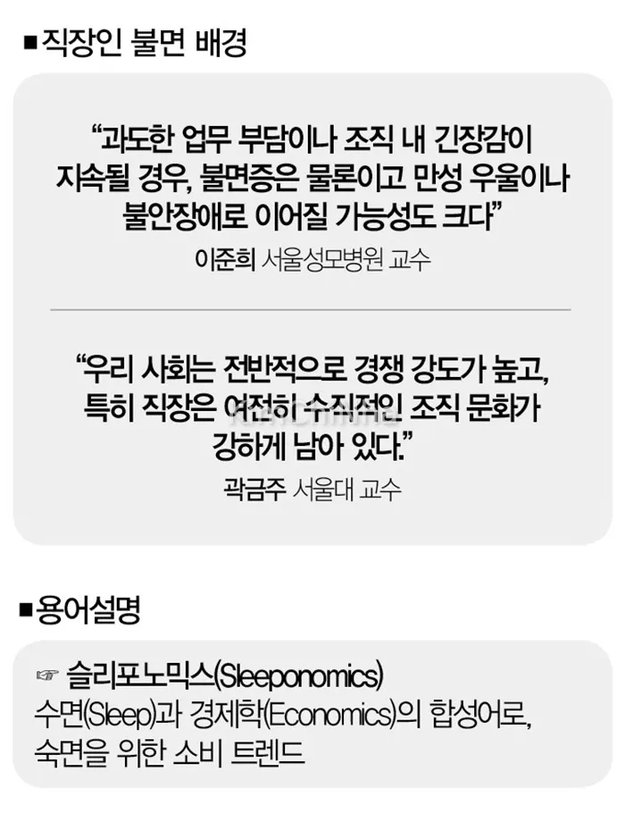 “Sleeponomics” là thuật ngữ chỉ xu hướng tiêu dùng liên quan đến giấc ngủ, xuất hiện khi ngày càng nhiều người gặp khó khăn trong việc ngủ ngon. Theo Hiệp hội Công nghiệp Giấc ngủ Hàn Quốc, thị trường sản phẩm hỗ trợ giấc ngủ trong nước đã tăng từ 480 tỷ won (2011) lên 3 nghìn tỷ won (2022), gấp 6,25 lần. Công ty nghiên cứu thị trường toàn cầu Research and Markets dự đoán thị trường sleeponomics toàn cầu sẽ đạt 153 nghìn tỷ won vào năm 2030.