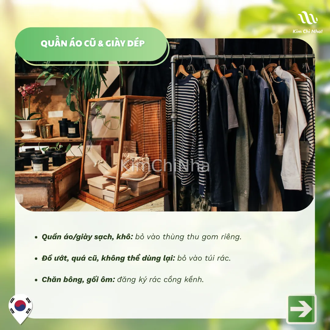 Quần áo/giày sạch, khô: bỏ vào thùng thu gom riêng.