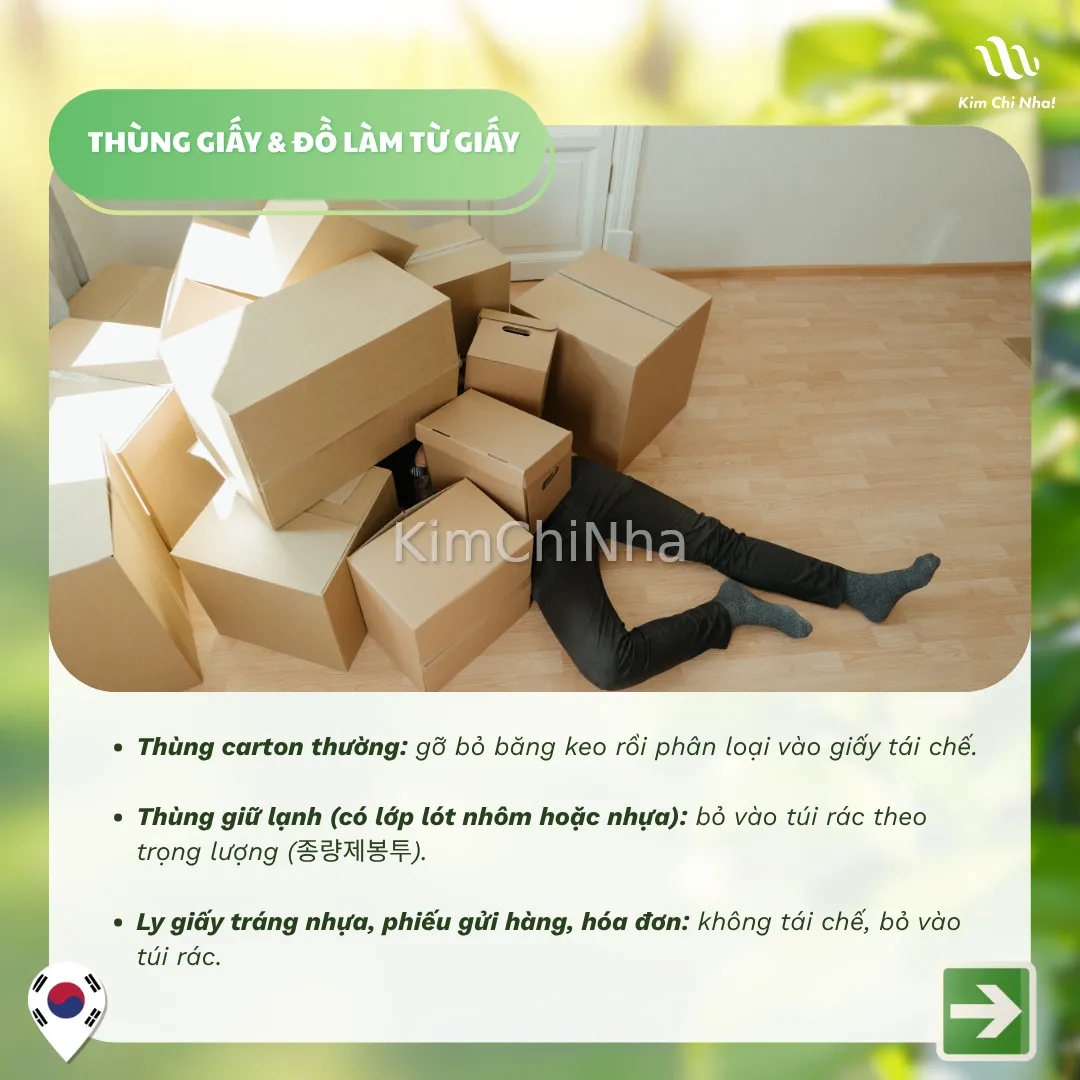 Thùng carton thường: gỡ bỏ băng keo rồi phân loại vào giấy tái chế.