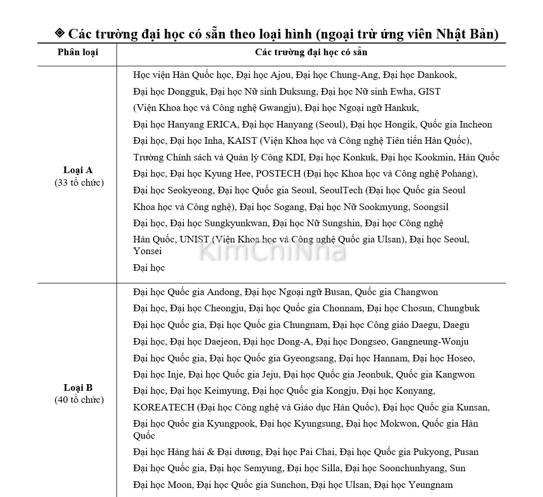 Lưu ý: Các ứng viên cần theo dõi kỹ danh sách trường công bố hằng năm, thường được cập nhật trên trang www.studyinkorea.go.kr