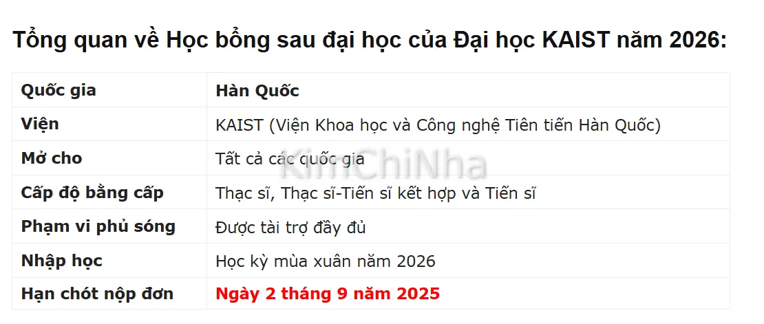 Học bổng Sau Đại học 2026 tại KAIST Hàn Quốc (Học bổng Toàn phần)