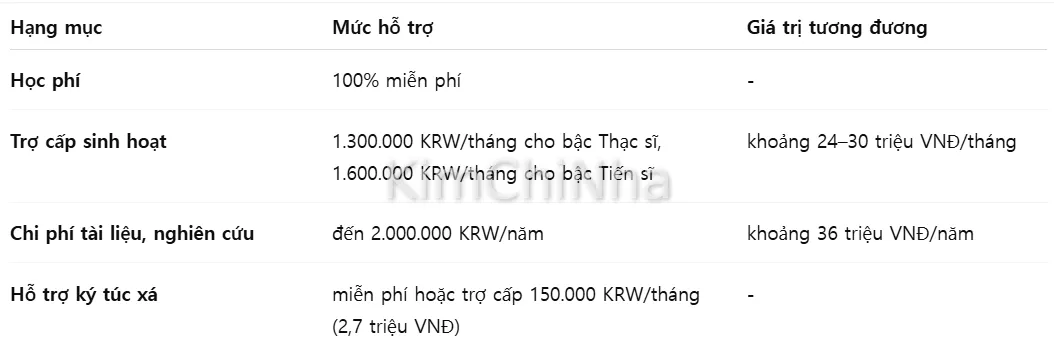 Ngoài học bổng cơ bản, sinh viên chương trình Tiến sĩ còn có thể nhận thêm TA Scholarship (Teaching Assistant) lên tới 300.000 KRW/tháng (~5,5 triệu VNĐ) khi tham gia hỗ trợ giảng dạy và nghiên cứu.