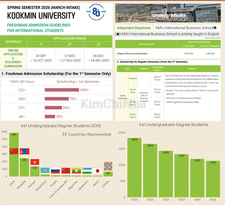 Kookmin University (국민대학교) là một trong những trường đại học tư thục danh tiếng tại Seoul, nổi bật với chương trình giảng dạy quốc tế thông qua Khoa Kinh doanh Quốc tế (KMU International Business School). Trường được biết đến với môi trường học tập năng động, khuôn viên xanh mát gần núi Bukhan và nhiều chính sách học bổng hấp dẫn dành cho sinh viên quốc tế.